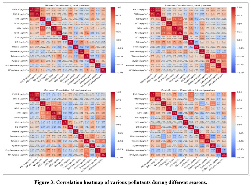 ![]() | Figure 3: Correlation heatmap of various pollutants during different seasons.