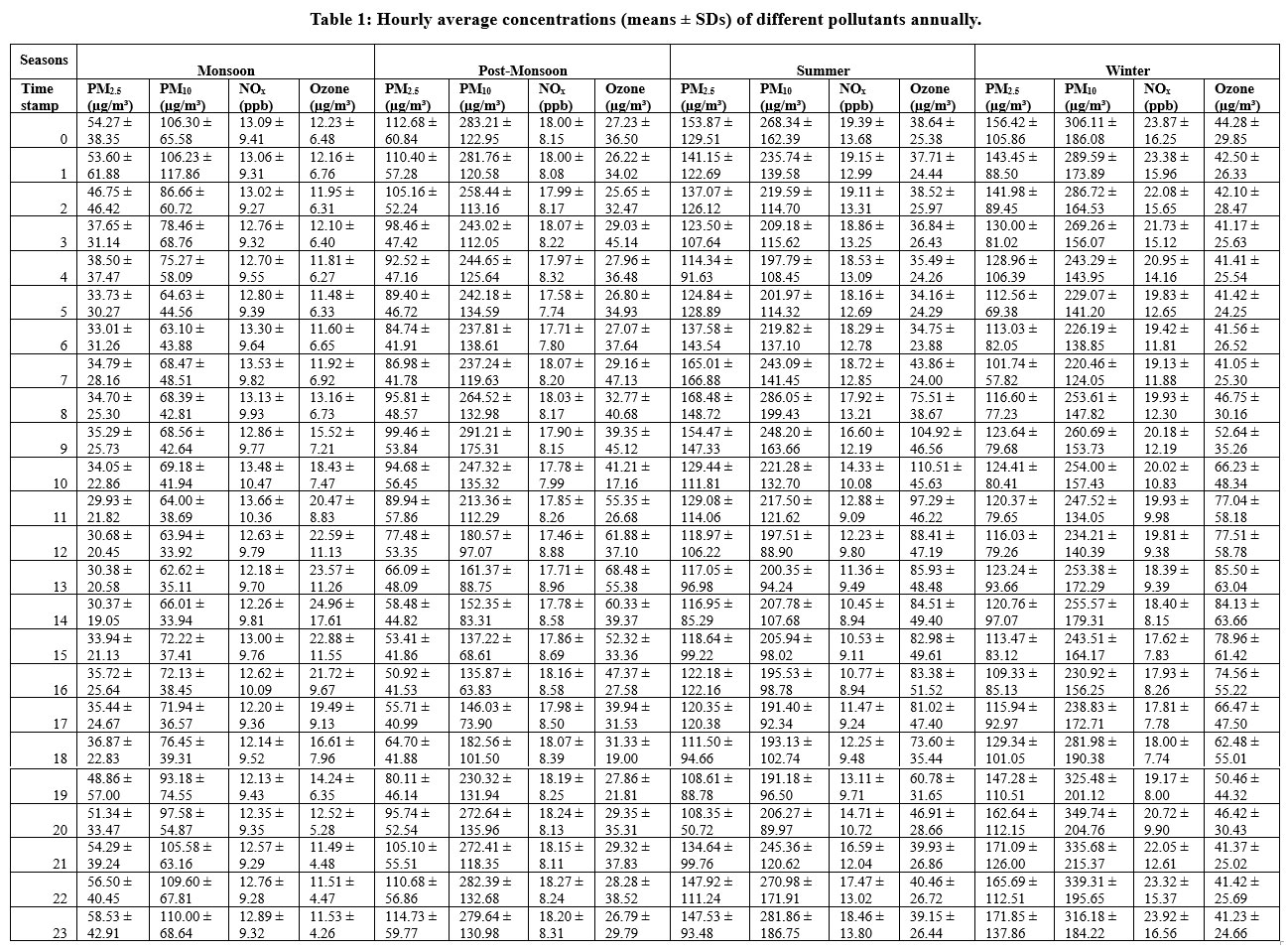 ![]() | Figure 2: Seasonal diurnal patterns of key air pollutants over a 24-hour cycle: Comparative analysis of monsoon, postmonsoon, summer, and winter