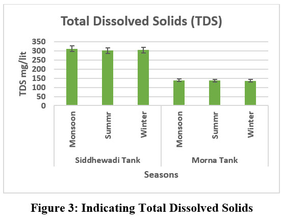 The Total Dissolved Solids signify the level of salinity in water.27Its a very essential parameter for establishing the standards for water quality. Total Dissolved Solids (TDS) shows an impact on water quality. Water that has a higher Total Dissolved Solids (TDS) content often has an unpleasant taste. TDS values fluctuate between 305 and 311 in Siddhewadi Tank, and 136 to 138 mg / L recorded in Morna tank (Fig. 3). The maximum value was recorded in the monsoon season due to rainfall, and the minimum value was recorded in the summer season of both tanks. The World Health Organisation (W.H.O.) recommends TDS level 500 mg/lit.15