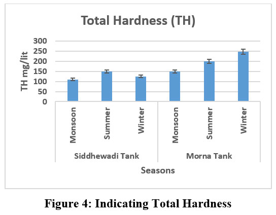 The levels of pH fluctuated with the changing seasons.19 pH remains alkaline during the study period in Morna Lake, while neutral in Siddhewadi Lake. A similar trend of pH was observed during study period.20 Total hardness of water is primarily attributed the presence of magnesium and calcium.21 pH increasing in the summer season, Pimparkar.22 pH in Morna Tank remained consistently alkaline across seasons, whereas Siddhewadi Tank showed values closer to neutral. This difference suggests stronger buffering and bicarbonate/carbonate influence in Morna, while Siddhewadi reflects more dilute and neutral conditions. Similar alkaline trends in Indian lentic ecosystems were reported by Tirupati.23