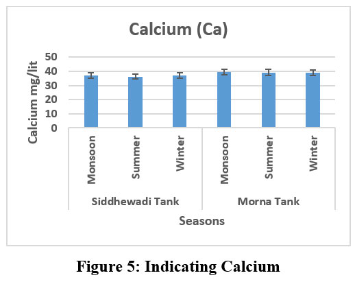 In Morna Tank, the maximum calcium level ranges from 39.3 mg/L during the monsoon season. In Siddhewadi Tank, the recorded minimum calcium level is 36 mg/L (Fig. 5).