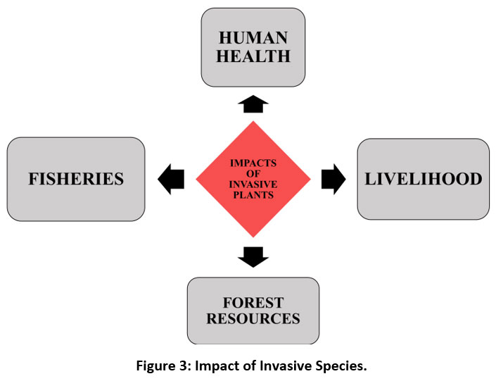 Human health and rural livelihoods in Assam are seriously threatened by invasive plant species, particularly in environmentally delicate areas like the Brahmaputra floodplains and forest edges. Invasive plant species are believed to be one of the major factors of loss of biodiversity, which is also responsible for alteration of ecosystem services and socioeconomic situations in a number of ways. The economic effects of invasive alien species can be severe for human endeavors including forestry, agriculture and fishing 38 as shown in the Figure 3.