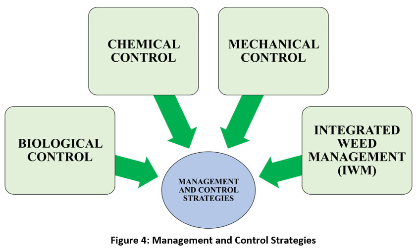 The widespread problem of invasive plant species (IPS) in Assam requires an integrated approach that incorporates several strategies suitable to target species, ecological conditions and available resources such as public education, policy implementation, biological control methods and integrated weed management., The effect of invasive plant species (IPS) on diverse environment of Assam can be managed and mitigated effectively by making collaboration among indigenous people, different governmental organizations and NGOs. The most economical approach is still prevention, which emphasizes strict quarantine regulations at points of entry and early detection and rapid response (EDRR) systems to find and eliminate new invasion before the invasive species get established.45 For effective management of invasive plants, a multi-pronged approach is required which integrates various control methods (mechanical and chemical) under an Integrated Weed Management (IWM) framework. Figure 4 shows some of the control strategies which are required to eliminate the invasion of invasive plant species.